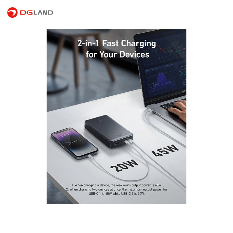 توان خروجی کل وات، پورت Type-C توان 45 وات و پورت USB-A توان 20 وات، دارای 2 درگاه Type-C و 1 دستگاه USB-A، پاوربانک تنها در 3.5 با توان 30 وات شارژ می شود، قابلیت امکان شارژ همزمان 3 دستگاه، مجهز به سیستم تشخیص جریان Power IQ 2.0